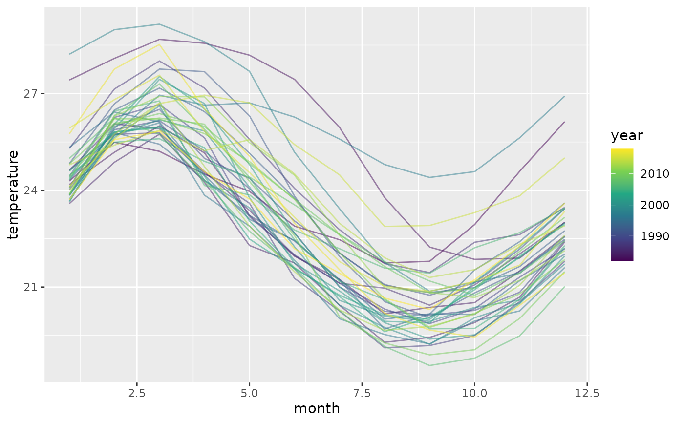 ggplot(elnino_sst, aes(x = month, y = temperature, group = year, color = year)) +